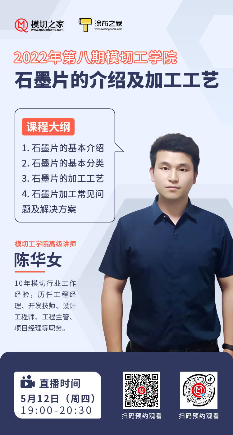 5月12日 19:00-20:30,為回饋廣大行業(yè)朋友, 我們將以“2022年第八期模切工學(xué)院·石墨片的介紹及加工工藝為主題,與大家進(jìn)行線上分享。