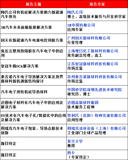 電子膠研修班同期4月12-13日舉辦“2023(第一屆)中國汽車電子用膠粘材料創(chuàng)新論壇“,報告主題和報告專家如下: