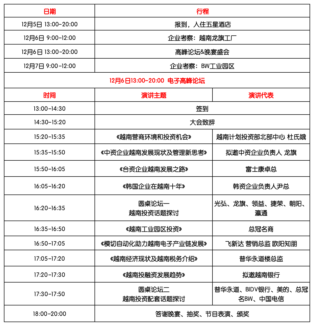 本次盛會旨在為國內(nèi)外電子廠商搭建起交流溝通的橋梁,聚焦解讀當(dāng)下消費(fèi)電子出海越南的土地園區(qū)、政策、市場、工廠管理、法律、關(guān)務(wù)等,是越南電子行業(yè)年度盛會,屆時品牌、中資工廠、韓資企業(yè)、越南本地企業(yè)、其他外資電子企業(yè)將齊聚一堂,實(shí)例探討未來五年越南電子企業(yè)展方向。300人全產(chǎn)業(yè) 鏈交流盛會。同期組織國內(nèi)80人考察團(tuán)赴越參與盛會,晚宴環(huán)節(jié)頒獎、抽獎、越南節(jié)目表演等。現(xiàn)誠邀廣大朋友撥冗出席,共同交流探討。