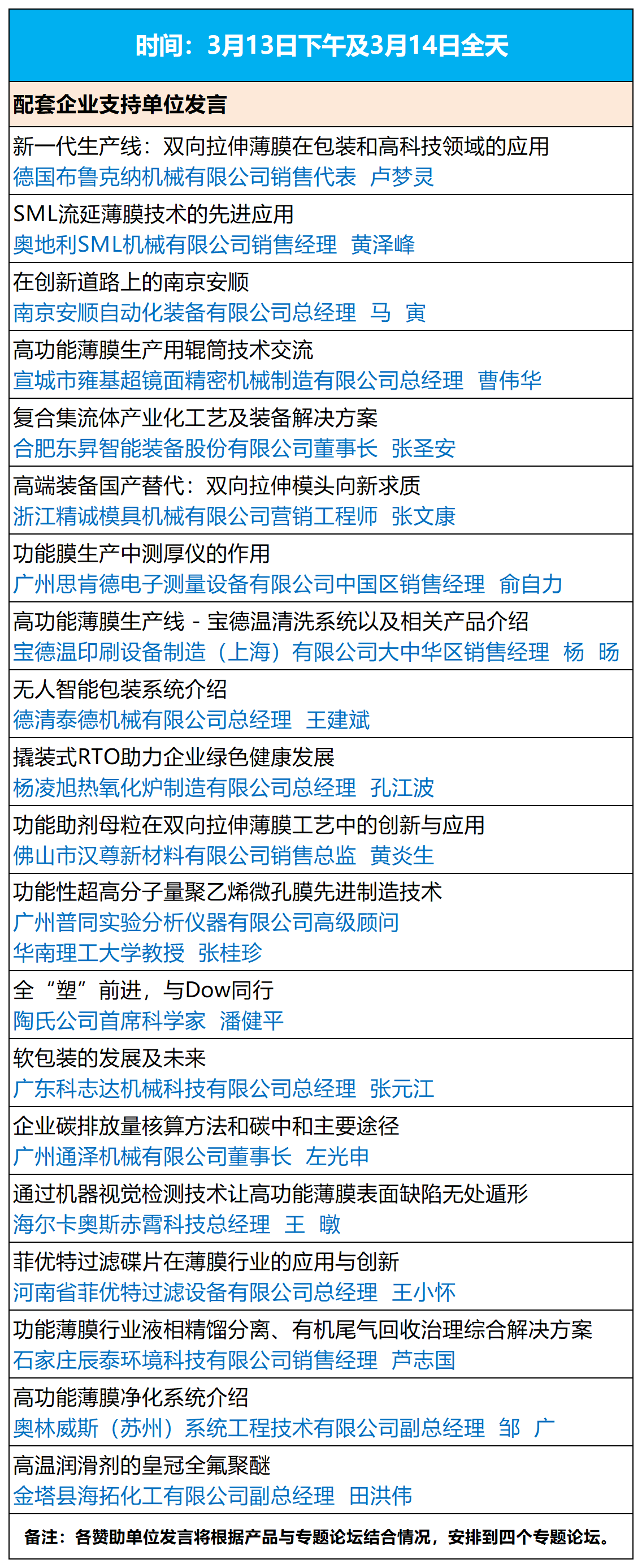1、高功能涂布、高功能雙向拉伸薄膜(BOPP、BOPET、BOPA、BOPE、BOPI、BOPS、BOPLA)、高功能流延薄膜(CPP、CPE、CPI、EVA、PVDF、PVDC、PVB等)、電池薄膜(鋰電池隔膜、鋁塑封裝膜、復(fù)合集流體、固態(tài)電解質(zhì)膜、氫燃料電池用質(zhì)子交換膜等)、高功能吹膜(LCP、高阻隔膜等)、高功能鍍膜、高功能復(fù)合膜(單一材質(zhì)復(fù)合軟包裝等)、光電顯示薄膜、氟膜等高功能薄膜生產(chǎn)企業(yè)免費參會,安徽省內(nèi)企業(yè)每單位限2人參會(協(xié)辦、支持單位除外);