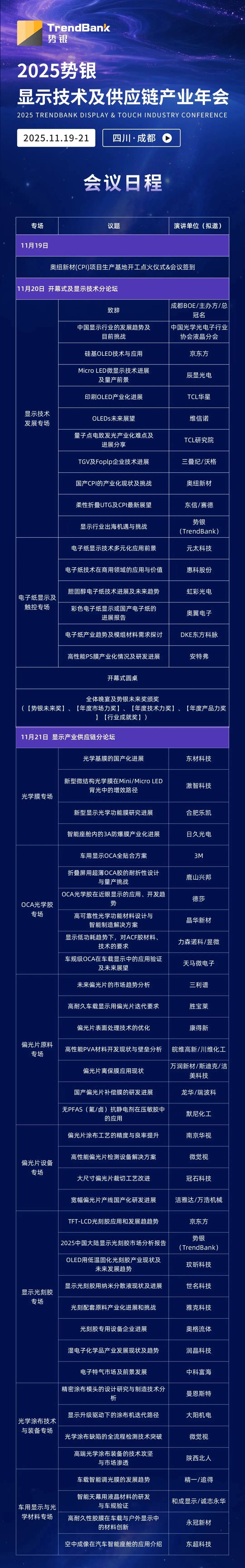 基于此,在整個顯示觸控產(chǎn)業(yè)鏈應(yīng)用、技術(shù)、產(chǎn)品持續(xù)創(chuàng)新,提質(zhì)降本趨勢下,勢銀(TrendBank)將于11月19 -21日在成都舉辦2025勢銀顯示技術(shù)及供應(yīng)鏈產(chǎn)業(yè)年會,同期也將舉行奧紐新材(CPI)項目生產(chǎn)基地開工點火儀式,本次也是奧紐新材成都CPI基膜生產(chǎn)線的首次點火,這也標(biāo)志著在CPI國產(chǎn)替代領(lǐng)域的一大突破。