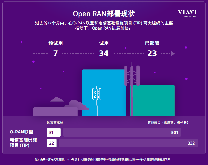 此次的《5G 部署現(xiàn)狀》還強(qiáng)調(diào)了不斷增長(zhǎng)的Open RAN生態(tài)系統(tǒng),這一生態(tài)系統(tǒng)結(jié)合了移動(dòng)運(yùn)營(yíng)商以及軟件和基礎(chǔ)設(shè)施供應(yīng)商,共同致力于開發(fā)采用嵌入式人工智能(AI)控制的開放式虛擬化無(wú)線電接入網(wǎng)(RAN)。截至2022年3月,已有64家運(yùn)營(yíng)商公開宣布參與Open RAN網(wǎng)絡(luò)的開發(fā)。其中,23家已在現(xiàn)網(wǎng)部署了Open RAN網(wǎng)絡(luò),34家處于試用階段,還有7家運(yùn)營(yíng)商公開表示其已處于預(yù)試用階段。