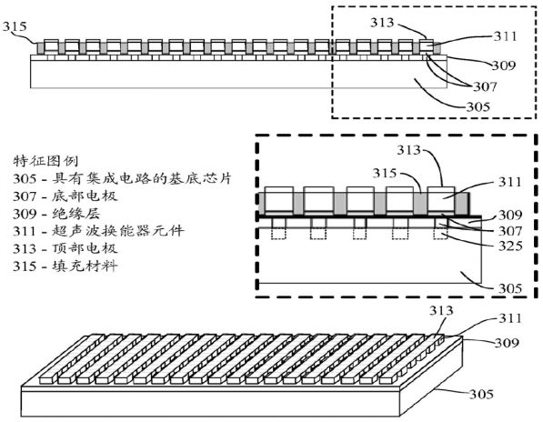 超聲波傳感器設(shè)備300包括超聲波換能器元件311,該超聲波換能器元件311包括粘合到底部電極307上的聲波換能器材料,例如壓電材料等。