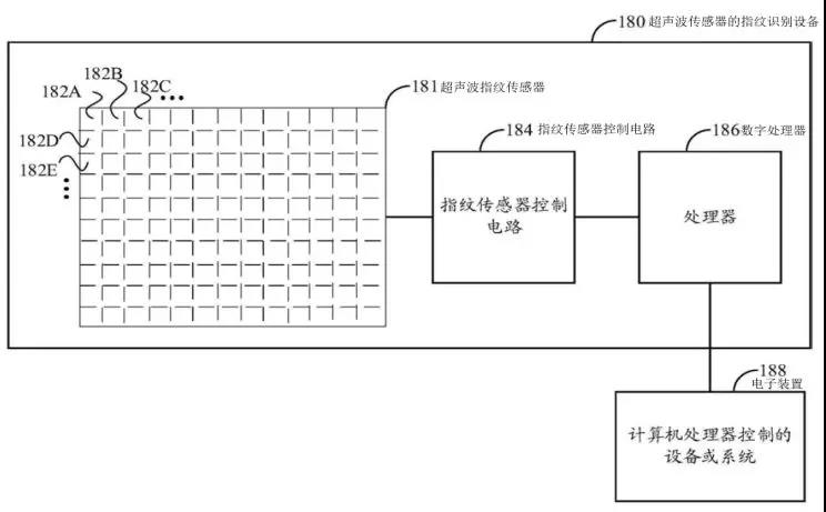 根據(jù)該專利技術(shù),首先由超聲波指紋傳感器181收集指紋信息,通過(guò)指紋傳感器控制電路184將該信息轉(zhuǎn)化并傳遞給數(shù)字信號(hào)處理器186,處理之后再將該信號(hào)傳輸給計(jì)算機(jī)處理器控制的設(shè)備或系統(tǒng)。