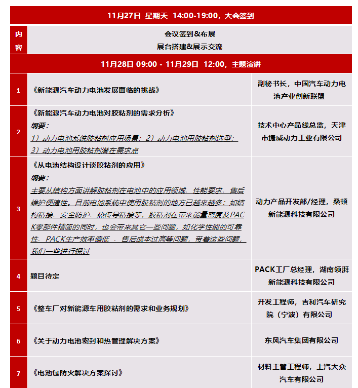 會(huì)議主題:熱失控防護(hù) | 隔熱防火性 | 高強(qiáng)度粘接 | 電池可拆解