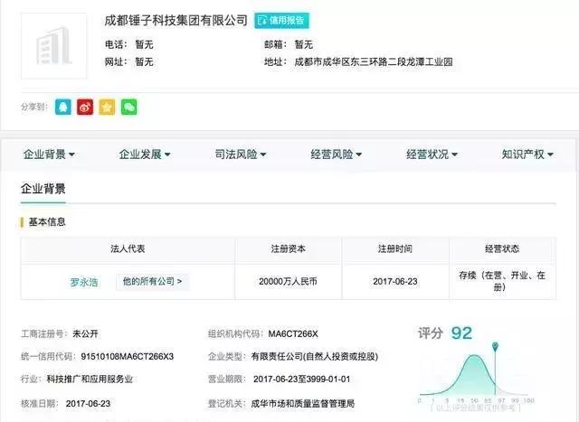 早在今年6月23日,羅永浩就在四川成都成立了“成都錘子科技集團有限公司”,注冊資本達2億元。公司的股東為羅永浩和錘子科技(北京)股份有限公司。