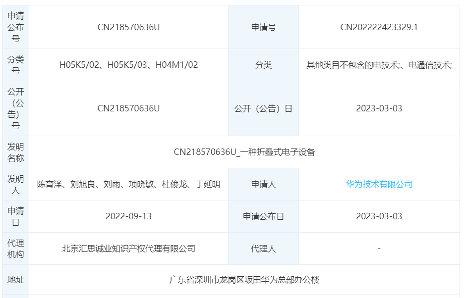 其中一項(xiàng)名稱為“一種折疊式電子設(shè)備”,公開(kāi)號(hào)為CN218570636U。專利摘要顯示,本申請(qǐng)涉及一種折疊式電子設(shè)備,包括轉(zhuǎn)軸和轉(zhuǎn)軸蓋,轉(zhuǎn)軸設(shè)有卡接槽,轉(zhuǎn)軸蓋包括蓋體和卡接件,卡接件的一端與蓋體可拆卸連接,另一端與卡接槽配合卡接。轉(zhuǎn)軸蓋與轉(zhuǎn)軸之間采用機(jī)械固定的方式連接,結(jié)構(gòu)簡(jiǎn)單,便于安裝,能夠極大的提升轉(zhuǎn)軸蓋與轉(zhuǎn)軸的連接強(qiáng)度,使轉(zhuǎn)軸蓋不易在使用過(guò)程中脫落,提升了折疊式電子設(shè)備的結(jié)構(gòu)穩(wěn)定性和使用壽命,且無(wú)需使用點(diǎn)膠,能夠進(jìn)一步降低蓋體轉(zhuǎn)軸之間的空間,安裝空間較小,有利于折疊機(jī)的輕薄設(shè)計(jì)。安裝時(shí),可使卡接件與卡接槽配合卡接,從而能夠?qū)⑥D(zhuǎn)軸蓋安裝于轉(zhuǎn)軸上,對(duì)轉(zhuǎn)軸進(jìn)行保護(hù),提升整機(jī)的結(jié)構(gòu)強(qiáng)度,且能夠提升整機(jī)結(jié)構(gòu)的一致性,進(jìn)一步提升用戶的使用體驗(yàn)。