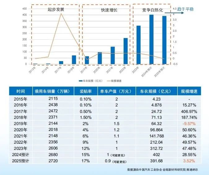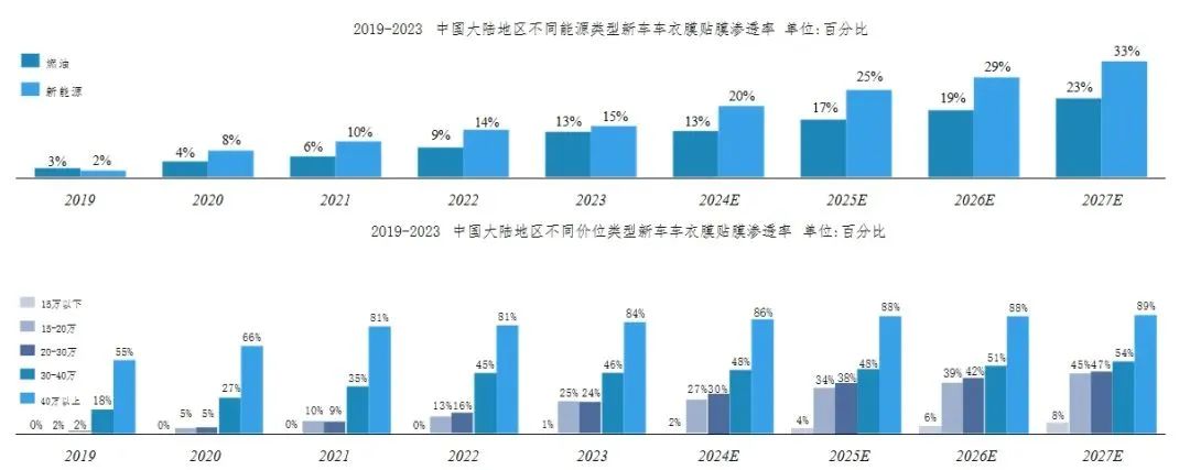 裝貼率雖然在穩(wěn)步上升,但價(jià)格內(nèi)卷已傳導(dǎo)至車衣膜行業(yè),車衣價(jià)格不斷下浮,規(guī)模增速趨于平穩(wěn),行業(yè)競(jìng)爭(zhēng)將愈發(fā)激烈。