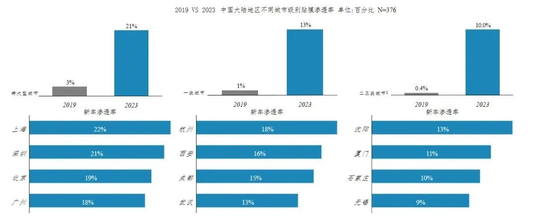 *數(shù)據(jù)來(lái)源:率捷咨詢《中國(guó)車衣膜產(chǎn)業(yè)鏈白皮書(shū)》 從城市分布看,特大型城市、 一線城市作為車衣膜的首要滲透地,其養(yǎng)成裝貼車衣膜的比例已呈現(xiàn)逐年提升的趨勢(shì),2023年,特大型城市和一線城市的貼膜滲透率分別達(dá)到21%和13%。