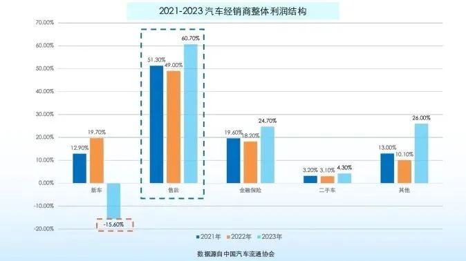 *數(shù)據(jù)來(lái)源:率捷咨詢《中國(guó)車衣膜產(chǎn)業(yè)鏈白皮書(shū)》 新能源車新車車衣膜貼膜滲透率高于燃油車,2023年達(dá)到15%。另外,據(jù)顯示,車價(jià)與貼膜的滲透率呈現(xiàn)正相關(guān)趨勢(shì),車價(jià)越高,車主對(duì)于車漆保護(hù)的意識(shí)愈加強(qiáng)烈。從2021年開(kāi)始,40萬(wàn)以上豪車新車車衣膜貼膜滲透率突破80%。但隨著行業(yè)進(jìn)入快速增長(zhǎng)期,低價(jià)車衣膜快速占據(jù)市場(chǎng),車衣群體不再是豪車陣列專屬。 *數(shù)據(jù)來(lái)源:率捷咨詢《中國(guó)車衣膜產(chǎn)業(yè)鏈白皮書(shū)》 從銷售端看,汽車生產(chǎn)商為了爭(zhēng)奪市場(chǎng)份額,不斷降低新車價(jià)格,盈利能力和空間不斷降低和壓縮,價(jià)格戰(zhàn)陰霾不散,汽車經(jīng)銷商開(kāi)始向后市場(chǎng)尋找利潤(rùn)增長(zhǎng)空間,后市場(chǎng)成為布局焦點(diǎn)。2021-2023年度經(jīng)銷商整體利潤(rùn)結(jié)構(gòu)中,新車銷售利潤(rùn)出現(xiàn)負(fù)增長(zhǎng),售后利潤(rùn)則達(dá)到60.7%。 這其中,車衣膜作為高增速、高利潤(rùn)率的產(chǎn)品,表現(xiàn)十分亮眼。