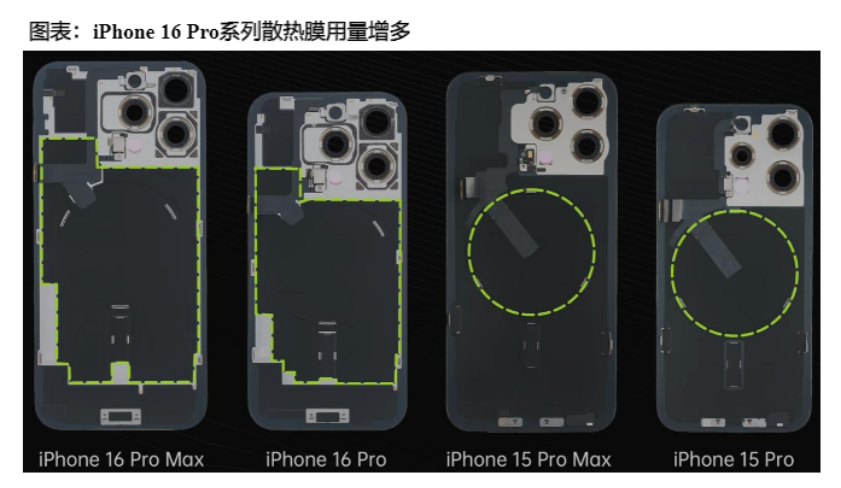 以iPhone為例,iPhone 15 Pro系列的散熱膜只覆蓋了無線充電線圈,而iPhone 16 Pro系列的散熱膜從線圈出發(fā)向四周延展,大致覆蓋了后蓋60%的面積來提升散熱效率。