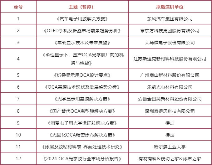 當(dāng)下,電子顯示技術(shù)正以驚人的速度朝著高分辨率、輕薄便攜和柔性可折疊等方向演進(jìn)突破,OCA 光學(xué)膠作為觸控屏與顯示面板的最佳膠黏劑,成為行業(yè)主流選擇。從智能手機到車載顯示再到智能家居、VR、AR顯示,OCA光學(xué)膠如同一條無形卻堅韌的紐帶,緊密連接著各類光學(xué)元件,成為實現(xiàn)卓越現(xiàn)實效果的核心技術(shù)支撐。近年來,隨著國產(chǎn)OCA光學(xué)膠產(chǎn)業(yè)迅速發(fā)展,國內(nèi)廠商如斯迪克、日久光電、凡賽特、新綸新材、鹿山新材、晶華新材、皇冠新材、富印集團(tuán)、高仁新材等多家企業(yè)技術(shù)突破,實現(xiàn)OCA光學(xué)膠商業(yè)化生產(chǎn)。然而,當(dāng)下OCA國產(chǎn)化替代仍任重而道遠(yuǎn),在高端市場中美國3M、德國德莎、日本三菱、日東電工、韓國LG等海外巨頭壟斷市場份額。 基于以上背景,有材有料&模切之家&涂布之家舉辦“2025第一屆OCA光學(xué)膠專題論壇”,大會將聚焦OCA材料行業(yè)現(xiàn)狀、發(fā)展趨勢、技術(shù)創(chuàng)新、應(yīng)用場景等熱點話題,攜手科研專家、行業(yè)技術(shù)大咖共同探討OCA行業(yè)發(fā)展面臨的機遇與挑戰(zhàn),推動產(chǎn)業(yè)鏈上下游協(xié)同創(chuàng)新,促進(jìn)OCA材料產(chǎn)業(yè)健康可持續(xù)發(fā)展。 大會主題:2025第一屆OCA光學(xué)膠專題論壇 主辦單位:有材有料&模切之家&涂布之家 大會時間:2025年4月25日 大會地點:江蘇 大會規(guī)模:300人 支持單位:無錫中星新材料科技股份有限公司、安徽明訊新材料科技股份有限公司、昆山思貝克復(fù)合材料有限公司、蕪湖韓保光學(xué)新材料有限公司··· 科研院校:中國科學(xué)院、哈爾濱工業(yè)大學(xué)、武漢理工大學(xué)、廣東工業(yè)大學(xué)、西南電子科技大學(xué)、南京工業(yè)大學(xué)、武漢理工大學(xué)、南京理工大學(xué)等; 智能終端廠商:華為、小米、OPPO、vivo、傳音、榮耀、Realme、IQOO、一加、魅族、紅米等 面板廠商:京東方、維信諾、TCL、天馬、華星光電、群創(chuàng)光電、友達(dá)光電、和輝光電、國顯科技、帝晶光電、惠科電子、信利光電、錸寶科技、中電熊貓液晶顯示、元太科技、顯創(chuàng)光電、中光電、久正光電等 模切廠商:領(lǐng)益智造、飛榮達(dá)、安潔科技、恒銘達(dá)、博碩科技、中石科技、達(dá)瑞電子、錦富技術(shù)、捷邦科技、萬祥科技、隆揚電子、冠石科技、鴻富瀚、智動力、思泉新材、可川科技等 活動費用: 【碼上報名】 參會及贊助咨詢熱線: 莫小姐 13686287350(微信同號)