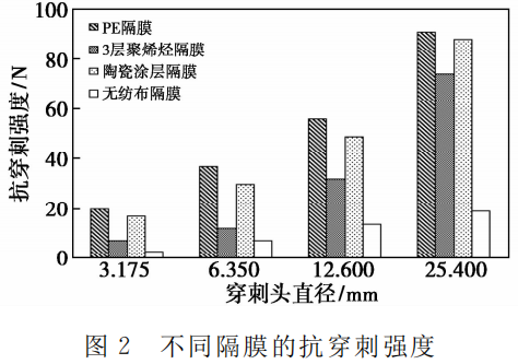 將內(nèi)徑32mm的穿刺夾具安裝在穿刺力測試儀上,選取直徑分別為3.175mm、6.35mm、12.6mm和25.4mm四種穿刺頭。參照GB/T 21302—2007進(jìn)行隔膜抗穿刺強(qiáng)度試驗(yàn),不同隔膜的抗穿刺強(qiáng)度見圖2。