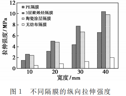 根據(jù)標(biāo)準(zhǔn) ASTM D882—2018將隔膜制成長條形試樣,總長60mm,標(biāo)距段長35m,按寬度分為10mm、20mm、30mm 和40mm四組。在單向拉力機(jī)上完成拉伸試驗(yàn),拉力加載速度為 25mm/min。不同隔膜的縱向 拉伸強(qiáng)度見圖1。
