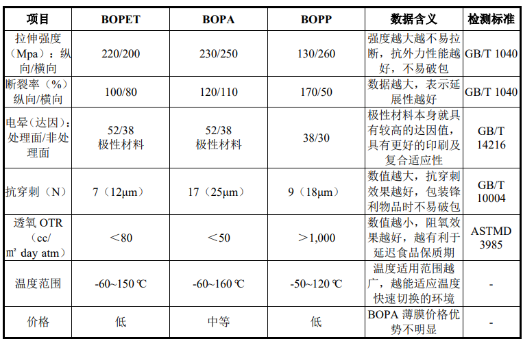 與 BOPP、BOPET 等競爭材料相比,BOPA 薄膜在拉伸強(qiáng)度、氧氣阻隔性、耐溫性上有優(yōu)勢,但成本較高。