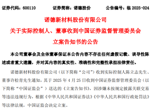 4月26日,諾德股份公告,公司實際控制人陳立志先生、董事許松青先生于2025年4月25日收到中國證監(jiān)會送達的《立案告知書》,因涉嫌未按規(guī)定披露關聯(lián)交易等違法違規(guī)行為,根據(jù)相關法律法規(guī),中國證監(jiān)會決定立案。