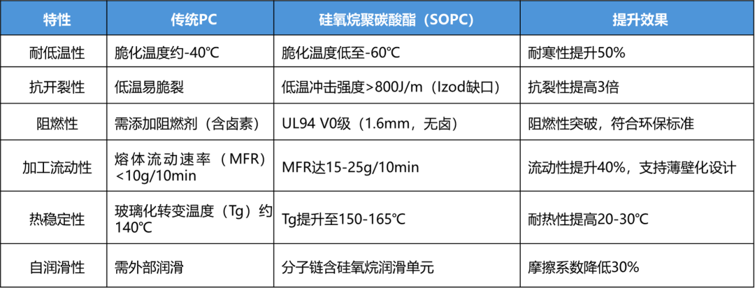 硅氧烷聚碳酸酯(Silicone-Oxane Polycarbonate, SOPC)通過引入硅氧烷單元,顯著提升傳統(tǒng)聚碳酸酯(PC)的性能: