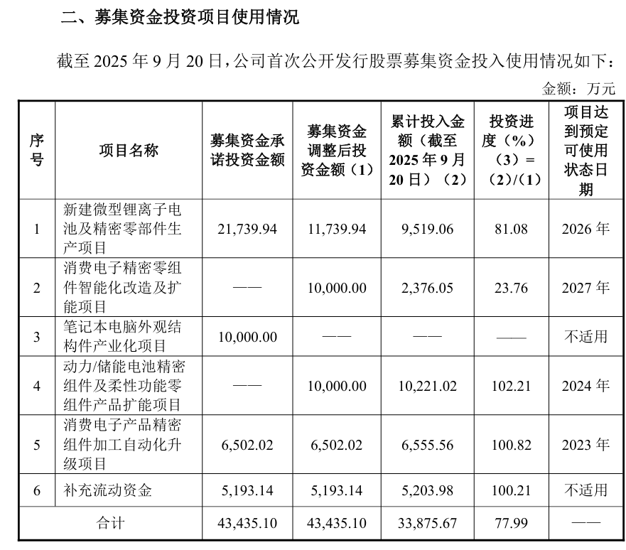 9月25日,蘇州萬祥科技股份有限公司召開相關(guān)會議,審議通過《關(guān)于終止部分募集資金投資項(xiàng)目并將剩余募集資金永久補(bǔ)充流動資金的議案》,擬終止“新建微型鋰離子電池及精密零部件生產(chǎn)項(xiàng)目”,并將剩余募集資金2679.94萬元(含利息收入)永久補(bǔ)充流動資金,該事項(xiàng)尚需提交公司股東會審議。