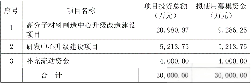 公司本次發(fā)行募集資金扣除發(fā)行費用后的凈額擬投資于“高分子材料制造中心升級改造建設(shè)項目”、“研發(fā)中心升級建設(shè)項目”及“補充流動資金”,擬使用募集資金1.85億元。