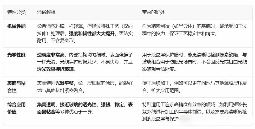 憑借這些特性,該薄膜在制造過程中使用的激光設(shè)備中的適用范圍得以擴大。例如,當(dāng)作為半導(dǎo)體制造工藝中的基膜使用時,有望提高使用短波長、高能量紫外線的加工過程的效率和成品的精細度;當(dāng)作為液晶屏幕保護膜使用時,則有望提升利用可見光進行像素缺陷檢測時的檢驗精度。此外,由于該薄膜的折射率接近于一般被認為折射率極低的玻璃水平,因此在作為防碎用途與玻璃貼合使用時,不會影響視覺清晰度。