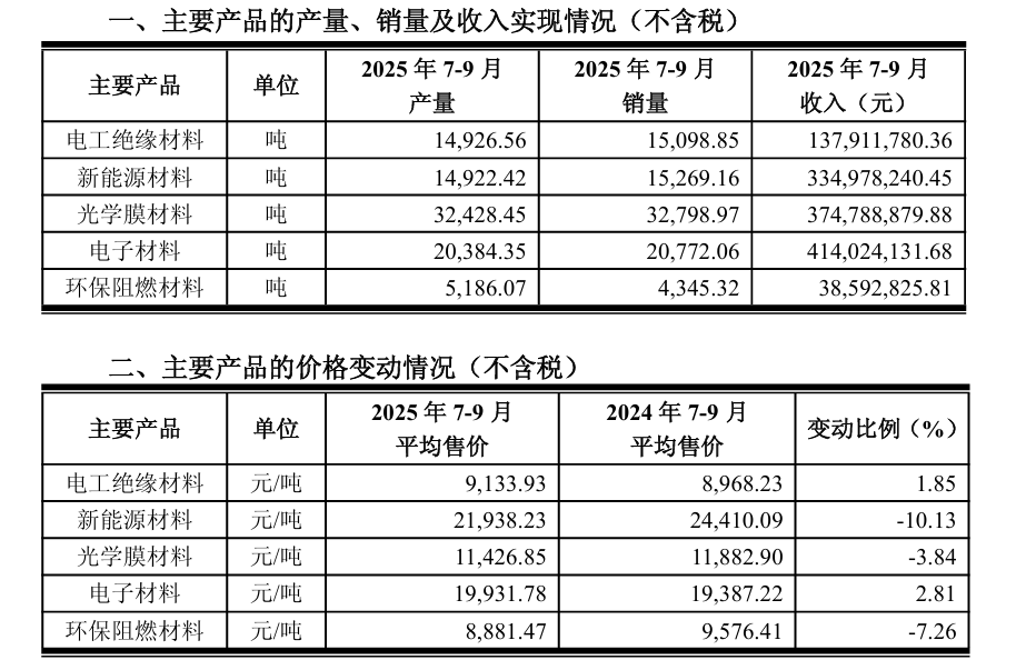 2025年前三季度,光學(xué)膜材料實現(xiàn)銷售收入10.12億元,同比增長20.67%;聚丙烯薄膜實現(xiàn)銷售收入2.99億元,同比增長11.90%;電子材料實現(xiàn)銷售收入11.02億元,同比增長37.19%。