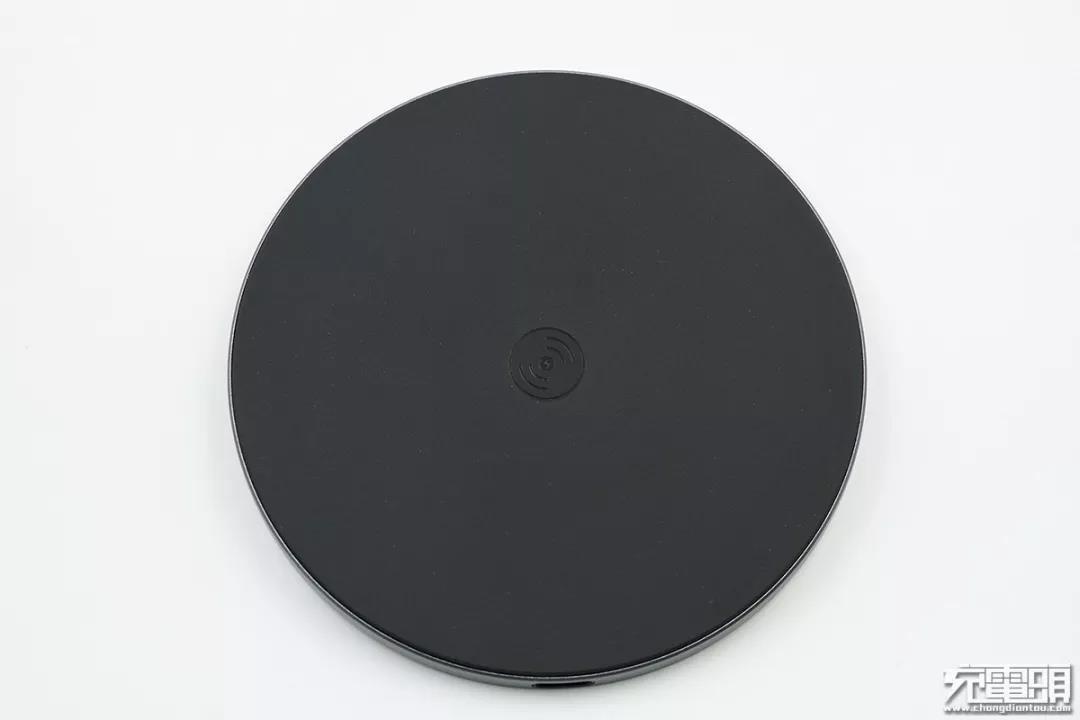 堅(jiān)果餅式無線充電座正面顏色為黑色,中心位置為一個(gè)無線發(fā)射的Logo。面板采用防滑的PC+TPU的材質(zhì),有效防止手機(jī)在充電過程中發(fā)生滑動(dòng)而造成意外跌落。