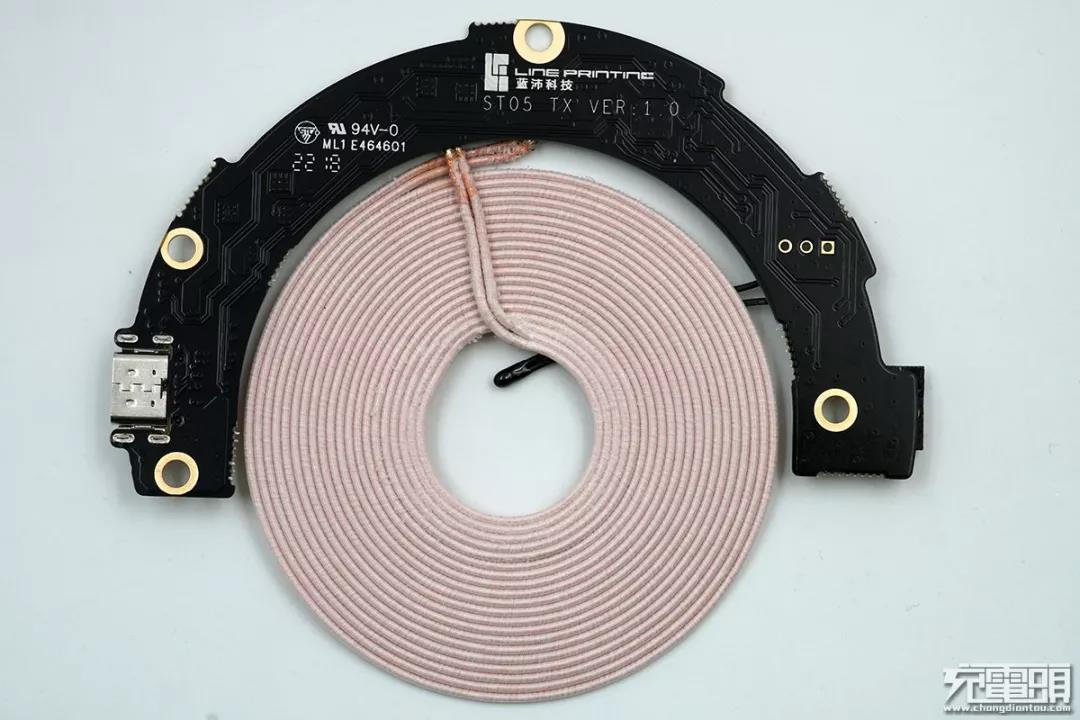 取下四顆螺絲,整個(gè)取下PCB板和線圈。PCB板背面標(biāo)示了產(chǎn)品代工廠:藍(lán)沛科技。