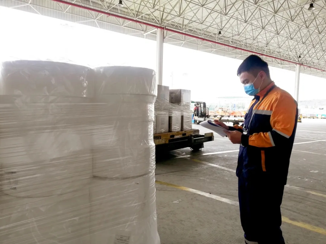 白云機(jī)場(chǎng)貨站與各保障崗位之間保持實(shí)時(shí)信息溝通,實(shí)現(xiàn)貨主辦單、提貨零等待。整批熔噴布從飛機(jī)落地到開始交付貨主僅耗時(shí)42分鐘。